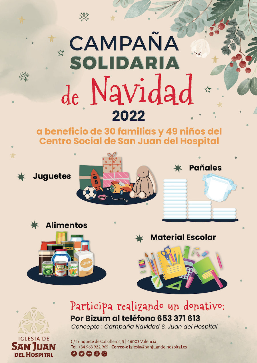 Para las 30 familias y 49 niños del Centro Social de San Juan del Hospital hemos lanzado la campaña de: juguetes, pañales, alimentos y materia escolar. Puedes colaborar realizando un donativo por Bizum al tel. 653 371 613 indicando en el concepto: Campaña Navidad S. Juan del Hospital»