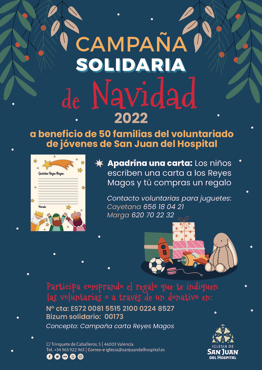 Por otro lado, para las 50 familias del voluntariado de jóvenes de San Juan del Hospital. Vamos a ayudarles en las cartas de los Reyes Magos de sus hijos, comprando un regalo que te indiquen las voluntarias. Las voluntarias para los juguetes son Cayetana 656180421 y Marga 620702232.