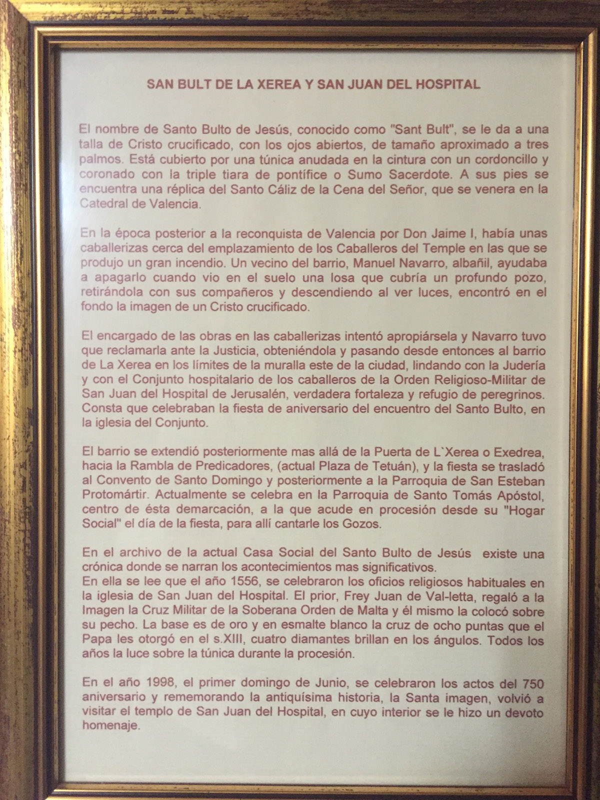 El domingo 1 de junio, a las 19:15 h, visitará la Iglesia de San Juan del Hospital la imagen románica del Cristo de Sant Bult (del latín vultus, que significa “rostro” o “imagen de Cristo”), hallada en el año de la conquista del Reino de Valencia por Jaime I.