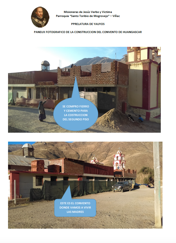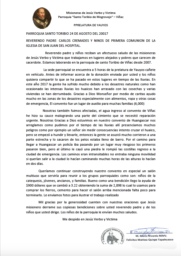 Este año todos estos donativos se han destinado a la Prelatura territorial de Yauyos, en Perú, que a través de Monseñor Ricardo nos indicó que sería bueno que se asignara al Distrito de Viñac, en concreto a las “Misioneras de Jesús Verbo y Víctima” que trabajan en lugares alejados y pobres. Os mostramos la carta donde nos cuentan el destino de dicho donativo.